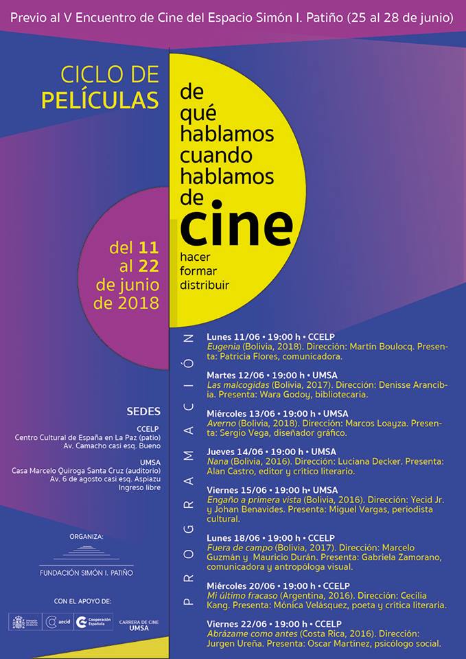 Antes de la realización del Encuentro, con el propósito de visibilizar la producción cinematográfica boliviana y latinoamericana y potenciar circuitos y formatos de exhibición alternativos, se realiza el Ciclo de Películas “De qué hablamos cuando hablamos de cine”, del 11 al 22 de junio, en el que se exhibirán siete películas bolivianas y dos documentales latinoamericanos de reciente estreno. El Centro Cultural de España en La Paz y la Facultad de Humanidades de la Universidad Mayor de San Andrés, a través de la Carrera de Cine, son las sedes de exhibición de este ciclo de películas.