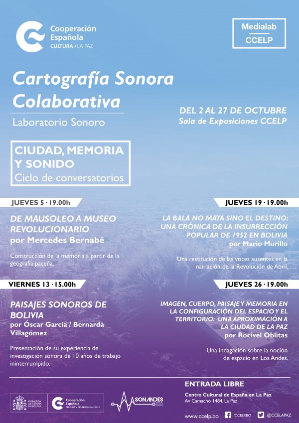Como parte de la Cartografía Sonora Colaborativa, se ha organizado el Ciclo de Conversatorios 'CIUDAD, MEMORIA Y SONIDO' que permitirá conocer otras investigaciones y experiencias en torno a la realidad física, sonora y viusal de la ciudad de La Paz.Estos conversatorios tendrán lugar semanalmente en la Sala de Exposiciones del CCELP.