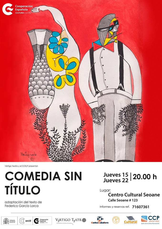 ‘Comedia sin título’ es un proyecto del Centro Cultural de España en La Paz y Vértigo Teatro, una joven compañía formada por egresados de la Escuela Nacional de Teatro. El proyecto pone en escena la obra inacabada de Federico García Lorca. La obra, que estrenó en el XI Festival Internacional de Teatro ‘Santa Cruz de la Sierra’ – FITCRUZ 2017 , podrá verse de nuevo en el mes de noviembre en dos funciones que acogerá el auditorio del Centro Cultural Seoane en Santa CruzUna historia que no tiene fin y que no la tendrá. El texto del poeta español está interpretado por Óscar Leaño, quien está acompañado de Juan Pedro Montefinale, Silvia Chambi, Marina Pereira, Ana Marcela Mendez, Gabriela Tapia y Mariana Sueldo