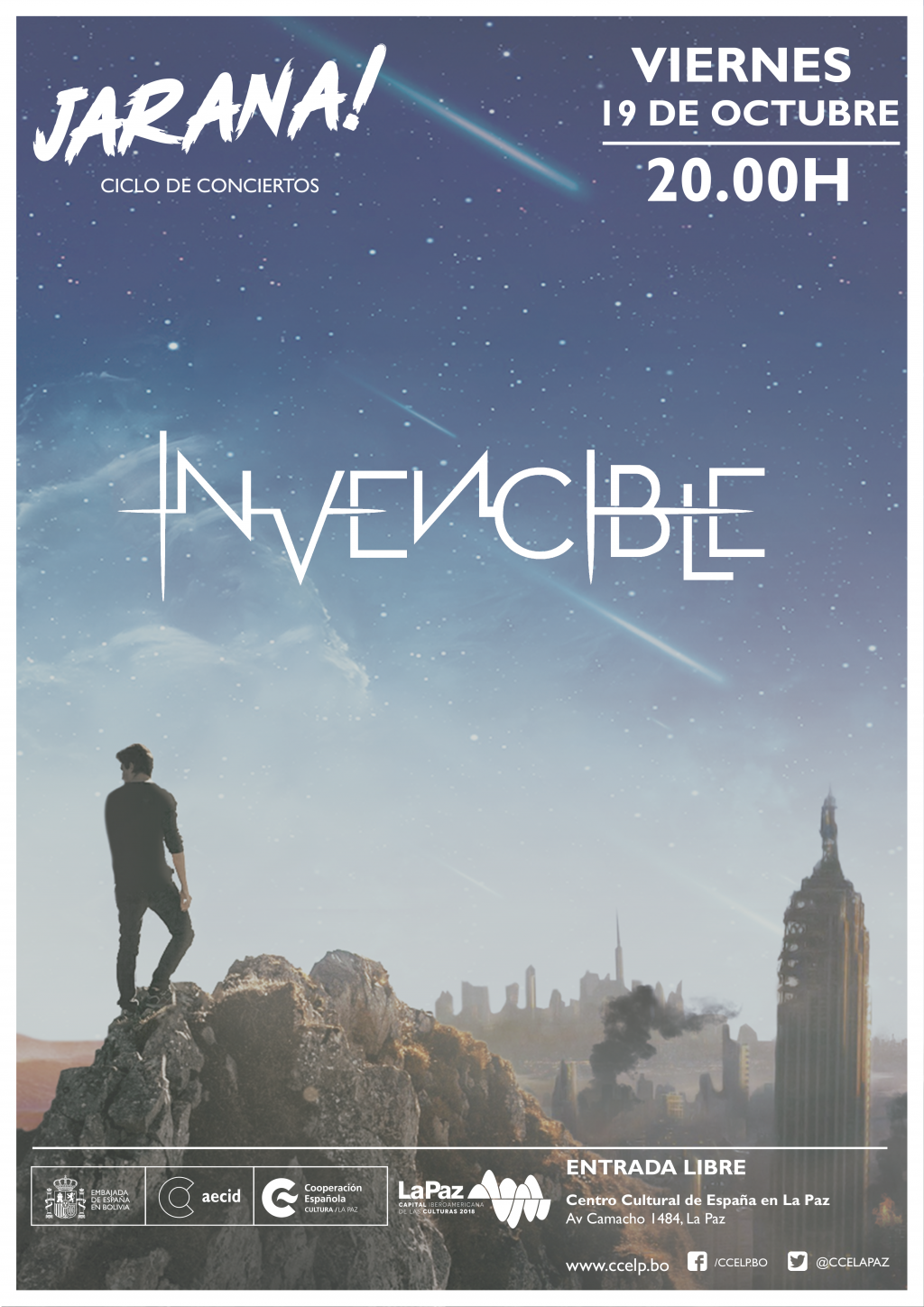 Este viernes 19 de octubre, a las 20.00 horas, vuelve la JARANA! del Centro Cultural de España en La Paz (CCELP) con la presentación de la banda paceña Invencible, banda boliviana de Rock fundada a inicios de 2016 por el guitarrista Ivan Peredo y el bajista Waldo Flores. Su sonido transita géneros como el Post-Hardcore, Rock Alternativo, Pop Punk, Easycore y Metal.