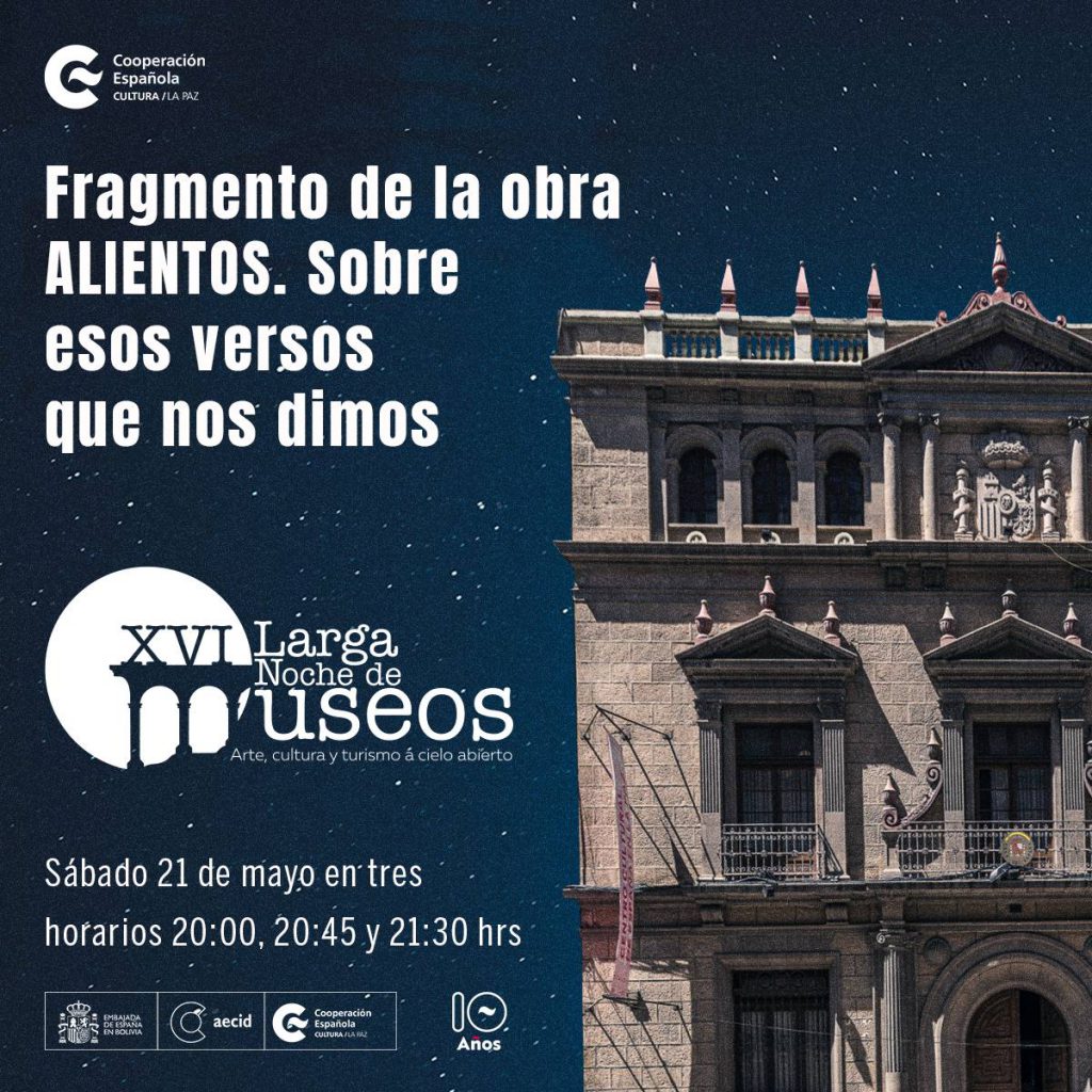 El elenco de la obra, dirigida por del dramaturgo Diego Aramburo, presentará fragmentos de la misma. El público podrá apreciar la puesta en escena de la una selección de poesías contemporáneas escritas por poetas españoles y bolivianos. Tendremos 3 presentaciones en los horarios de 20:00, 20:45 y 21:30.