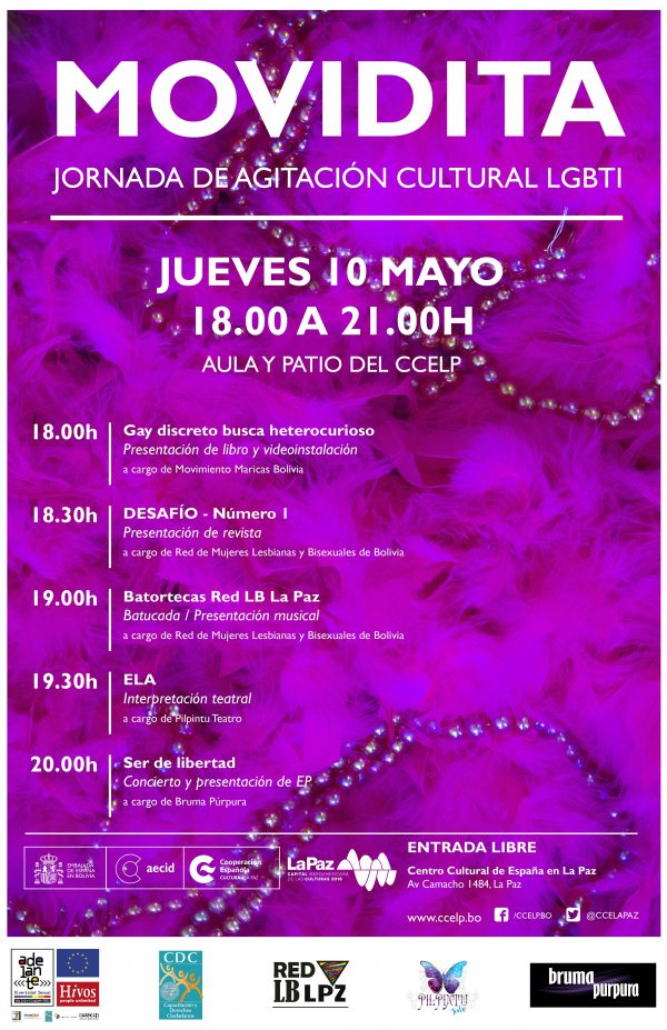 El próximo jueves 10 de mayo, el Centro Cultural de España en La Paz (CCELP) acogerá una jornada de actividades culturales de temática LGBTI. La ‘Movidita: jornada de agitación cultural LGBTI’ es una de las actividades de cierre del proyecto ‘Adelante con la Diversidad Sexual: Cambio e innovación social para el ejercicio pleno de los derechos LGBTI’, una acción de 30 meses de duración que se ha venido desarrollando en Bolivia, Perú y Ecuador financiada por la Comisión Europea e HIVOS, implementada por dos organizaciones en cada uno de los países de acción.